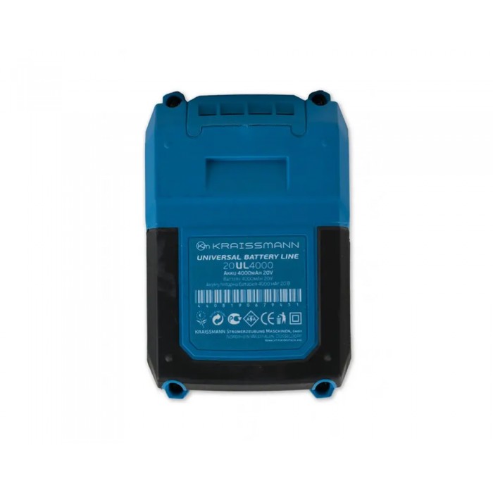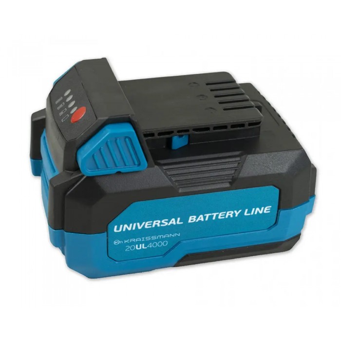 Аккумуляторная батарея Kraissmann 20UL 2.0 A/h для линейки универсального инструмента «Universal Battery Line» от торговой марки «Kraissmann» устанавливается на аккумуляторные пилу, шуруповерт, сабельную пилу, угловую шлифовальную машину, краскопульт. Данная батарея является аккумулятором литий-ионного типа, напряжение батареи составляет 20 В, емкостью 4,0 А/ч . Подходит к линейки аккумуляторного инструмента ТМ Kraissmann таким как:
